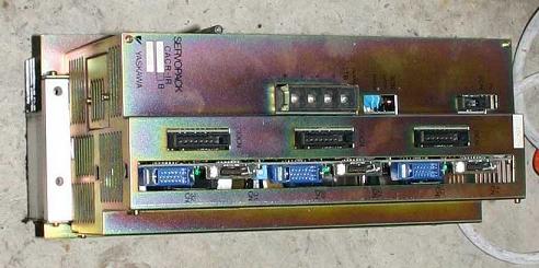 During 2008 we improved bench test station for Mitsubishi MDS (A, B, C) series servo drives. Dual axes servo drives such as MDS-C1-V2-4545, spindle drives MDS-C1-SP-150, 260, 300, power supply MDS-C1-CV-260. The new test station completely equipped with power supply MDS-C1-CV-260, Mitsubishi Meldas CPU C64, PLC and NF3210TV1-8260 NC panel computer. Repaired units test performed on original OEM servo and spindle motors, rotation of which controlled from touch screen in a JOG mode or from a handle in a manual mode.
